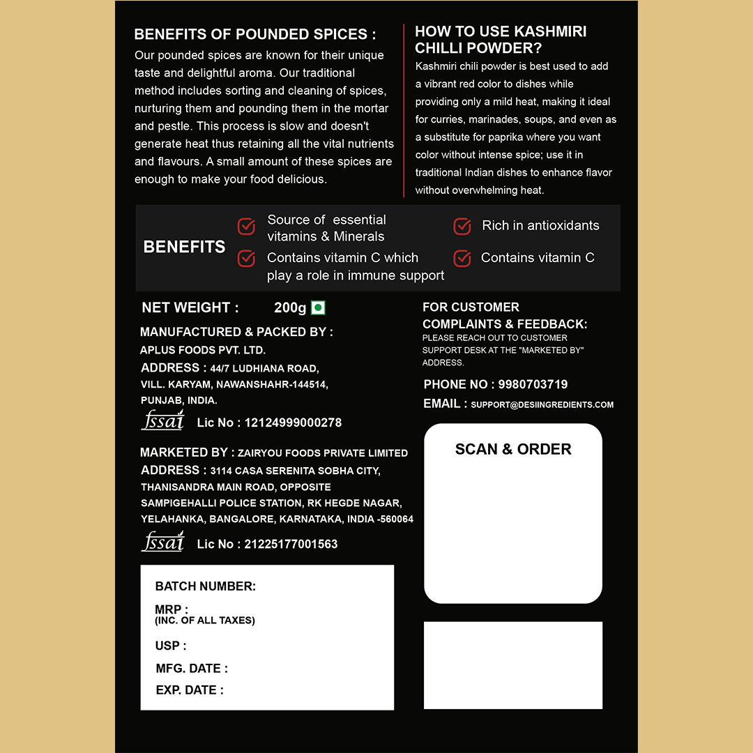 Kashmiri Chilli Powder is made from 100% natural quality red chillies.